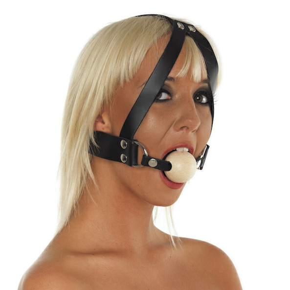 Category: Gags Code: 1130-1325 Genuine leather gag with wooden ball and head strap, adjustable with buckle. Color: Black Flexibility: Slight Designed for: Men and Women Brand: Rimba