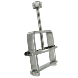 Category: Nipple Clamps Code: 1130-1412 Put the squeeze on your sub with this Stainless Steel Nipple Vise. Place the opening over their nipple and tighten the adjustable clamp a little for some light pressure or a lot for a more disciplinary pinch. This diminutive device packs a lot off nipple gripping power. Measurements, 2.75 inch overall length fully opened, 1.5 inches wide, Clamp adjusts internal opening from 0 to 0.97 inches. Color: Silver Flexibility: Rigid Designed for: Men and Women Brand: Master Series
