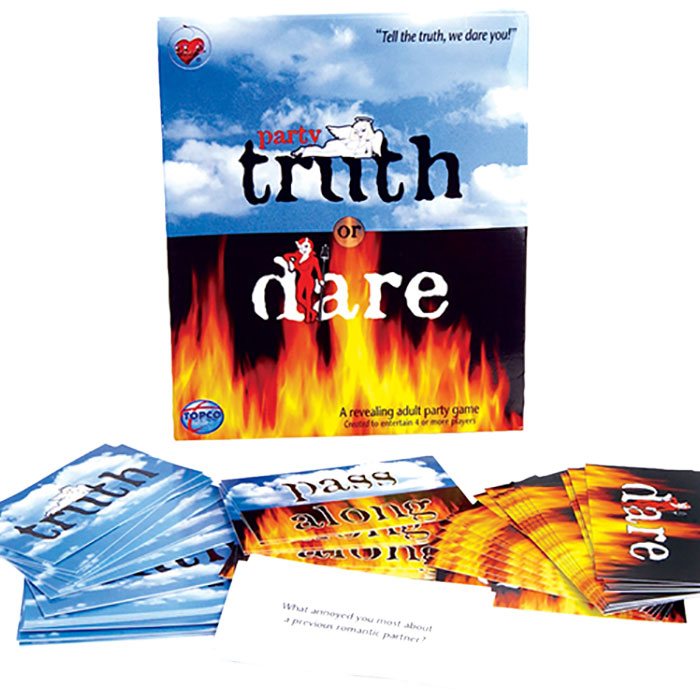 Category: Other Sex Toys Code: 1130-411 Imagine finding out your friends darkest secrets or daring them to do something you've always wanted to watch them do. To play simply roll the enclosed dice, even number you pick a truth card odd number you pick a dare card. It's exciting as it is fun and is only limited by your inhibitions. Set contains 1 deck of Truth cards, 12 Pass cards, instructions and one die. Designed for: Men and Women Brand: Top Co