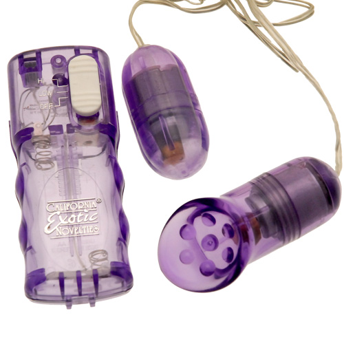 Category: Stimulators Code: 1130-2516 Get twice the sensual pleasure with 2 interchangeable stimulators, a powerful vibrating bullet and textural vibrating contoured clit cup. Plug into the 2 speed power pak for an incredibly erotic delight. Size: 3 Inches Color: Purple Flexibility: Firm Controller: Wired Designed for: Women Brand: California Exotic